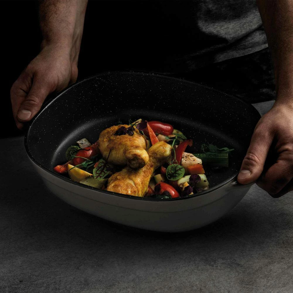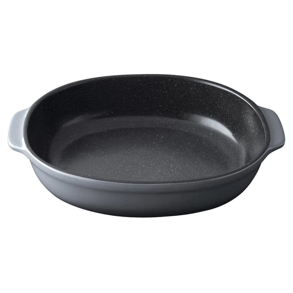 A classic potato gratin, a comforting winter casserole or a strawberry bread pudding, it all tastes equally good when you bake it in this oval baking dish. Equipped with wide handles for an easy grip and an enamel coating that ensures easy food release and effortless cleaning, this grey stoneware dish is stylish enough to go straight from the oven to the table and durable enough to last for years to come. Your one-stop-shop for bakeware since it is microwave, oven and dishwasher safe. Inside cooking dimensions 11.25 in. x 8.75 in. x 2.75 in.