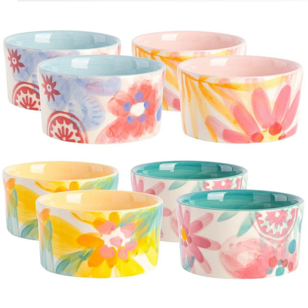 Add a playful and colorful twist to your home bakes with the Goji Blossom 8-piece ramekin set. With 8 ramekins in four individual floral designs, this set will help you to step up you’re serving and single serve bakes to the next level. Each ramkekin has a watercolor floral design on outer and solid interior in different colors. This oven safe bakeware set if perfect for serving individual desserts to your guests, putting out appetizers, and the perfect solution for when you want a treat just for you. Prep both savory and sweet dishes with this set.