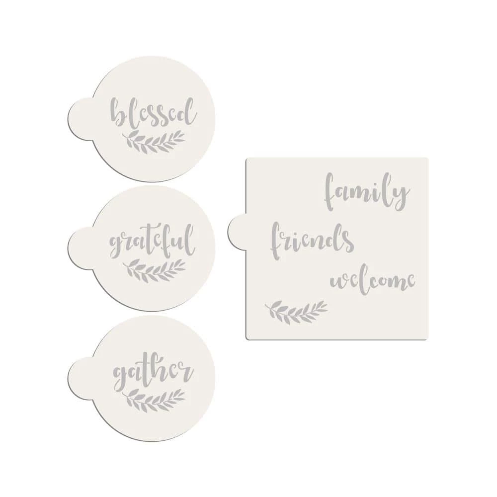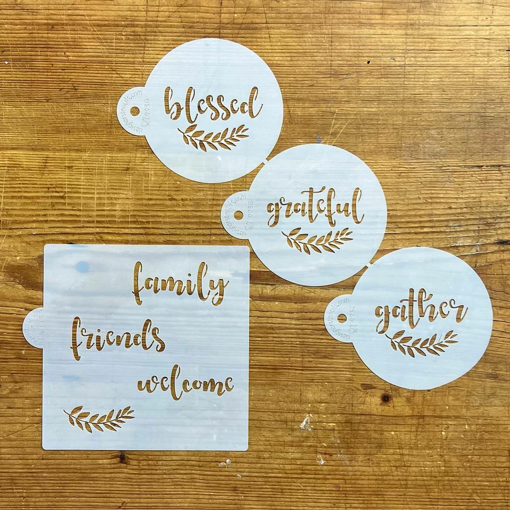 This bundle gives you 7 different script lettering patterns for decorating your circle cookies. 1 set of 3 stencils include Gather, Blessed, and Grateful lettering. The other set of 4 stencils includes Family, Friends, Welcome, and a leaf design. Cut on durable, 10 mil food grade plastic, each of stencil circle is 3.75 in. high to fit a 3 in. to 4 in. circle cookie cutter. The stencil rectangle is 5.5 in. high, but the individual designs on the stencil will fit a 3 in. to 4 in. circle cookie cutter.