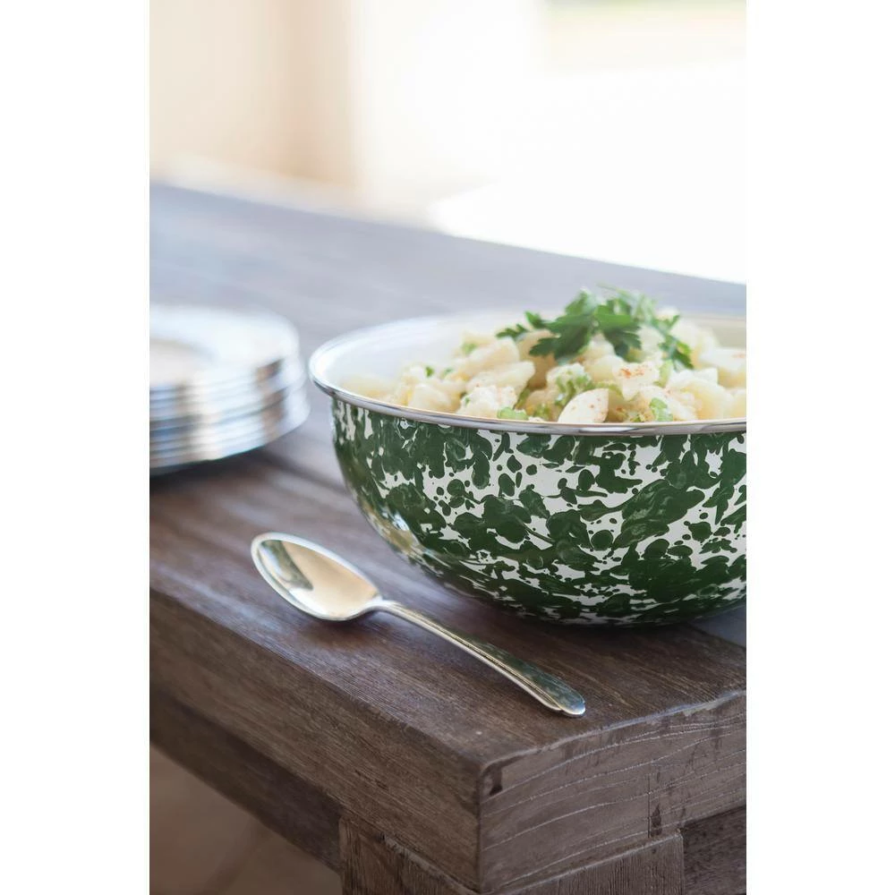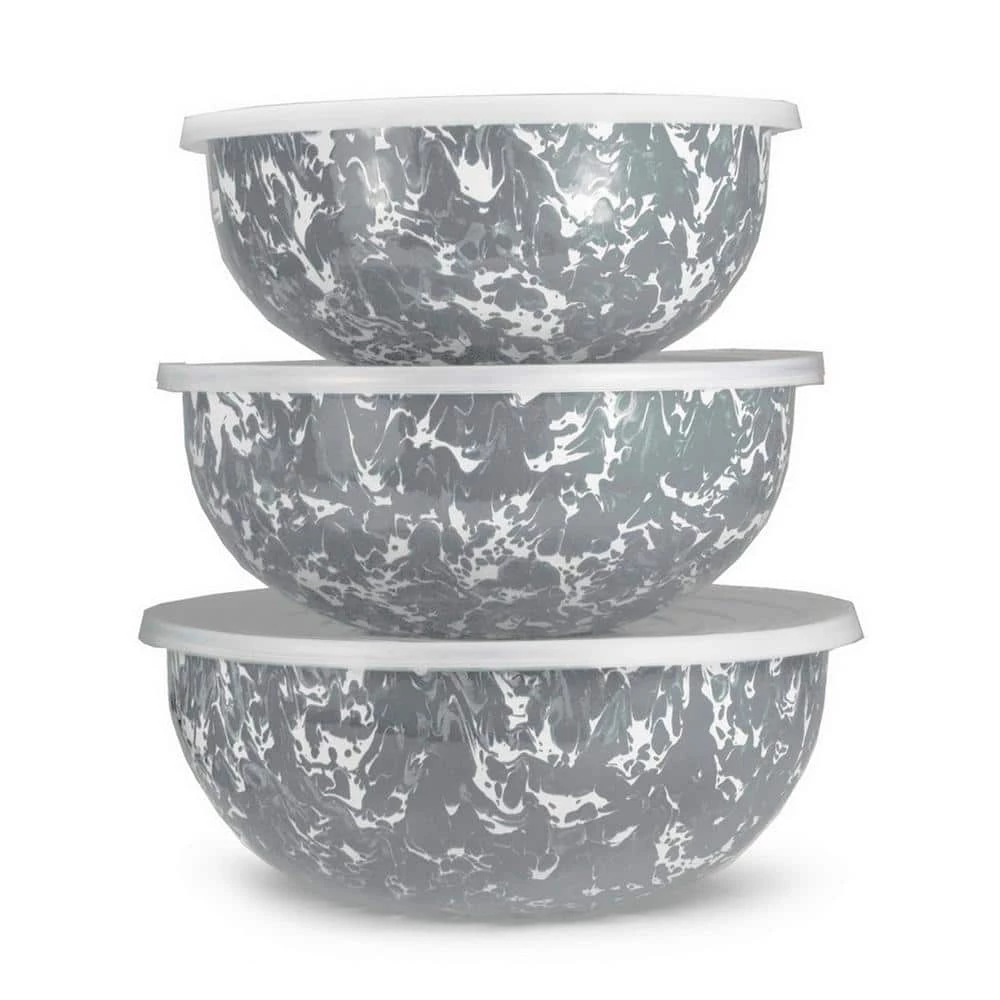 Set of 3 bowls with lids, 8.75, 9.5 & 10.5 inch diameters, 3, 3.5 & 4.5 quart capacities. This enamelware is made of carbon steel coated with a porcelain enamel and trimmed in stainless steel. There will be variations in the shading of colors and pattern formations which are the results of the hand-dipped process. The swirl design is a classic, retro staple for enamelware cookware and serveware. The contrast of colors creates a distinct look and brings a casual artistic flair to your table setting. Each piece is individually hand crafted and is as unique as you are. Skilled artisans hand dip the white background color, then use a brush to hand apply the secondary color swirls. This creates a unique piece and design each time. The elegant and inviting aesthetic draws the eyes into the many spattered patterns flowing throughout. Your piece will be one-of-a-kind and exclusive to you as you create your own distinctive style.