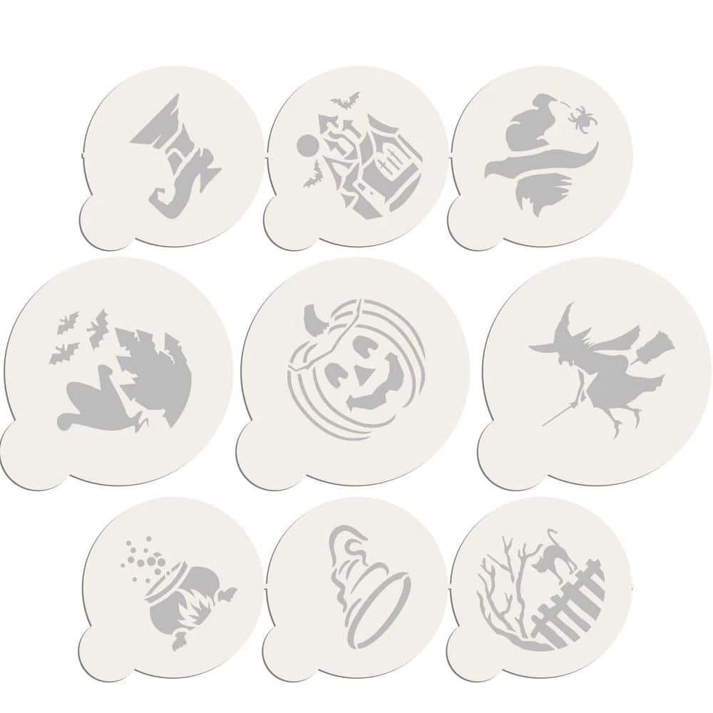 This bundle gives you 9 different Halloween patterns for decorating your circle cookies. 1 set of 3 stencils include Witch on Broom, Jack O’ Lantern, and Ghost, Bats and Castle Scene. The other set of 6 stencils include Cauldron, Witches Shoe, Witches Head, Witches Hat, Spooky Castle Scene, and Cat on Fence Scene. Cut on durable, 10 mil food grade plastic, each of the smaller stencil circle are 3.75 in. high to fit a 3 in. 4 in. circle cookie cutter. The larger stencil circle is 4.75 in. high to fit a 3.5 in. to 5 in. circle cookie cutter.