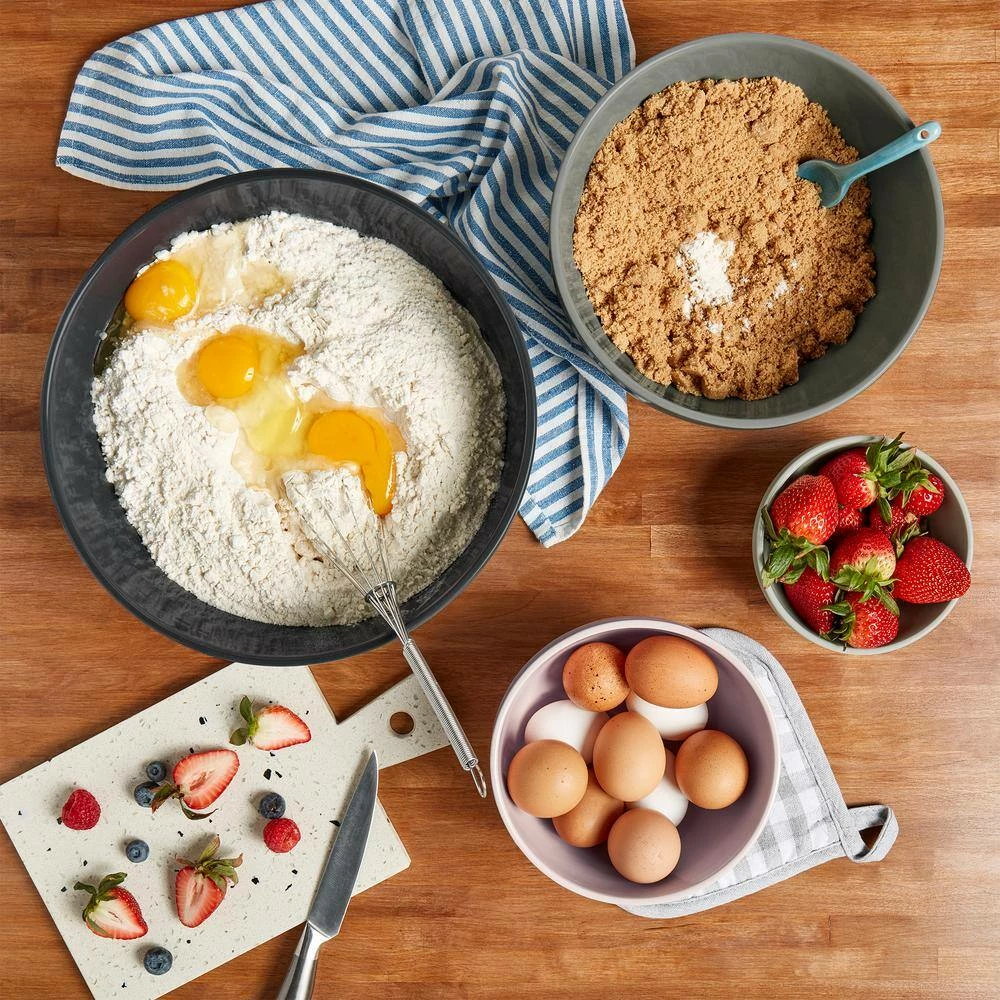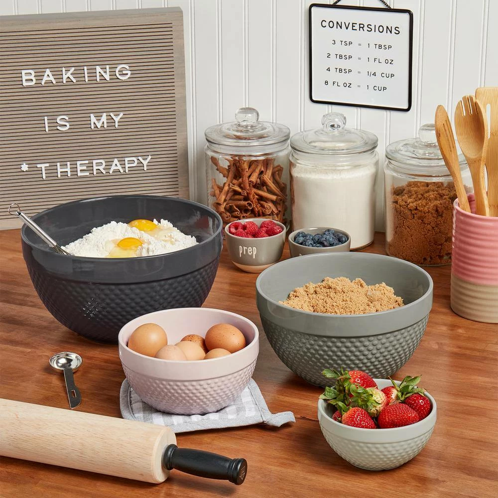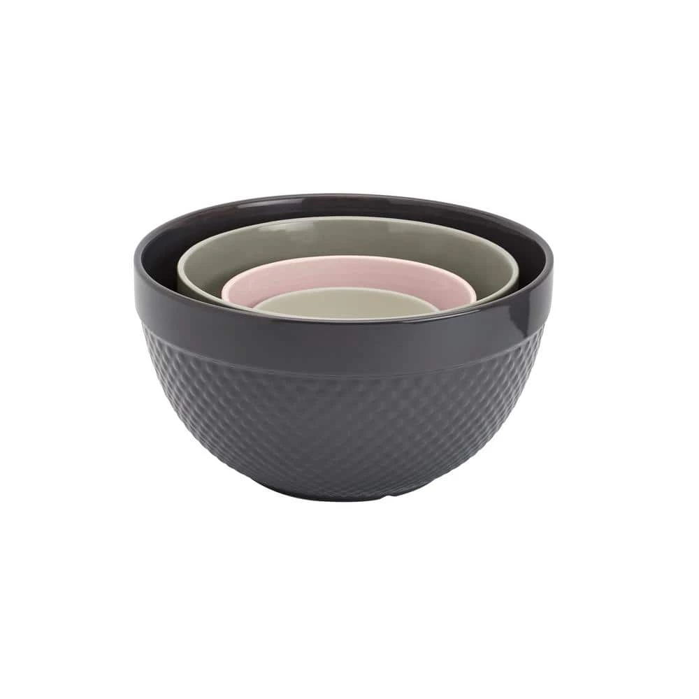 Our embossed Hobnail mixing bowls bring a vintage style to your kitchen, with a simple textured pattern that gives each bowl a casually elegant look and a comfortable grip for mixing together ingredients. Charming and easy to use, these stoneware mixing bowls are conveniently freezer safe, microwavable, and dishwasher safe and can nest together for efficient storage in the kitchen. This set comes with a useful range of bowl sizes, perfectly designed for mixing, whisking, food prep, and casually storing items on the counter. Combining style with functionality and convenience, this versatile set can be your go-to bowls for all of your kitchen needs.