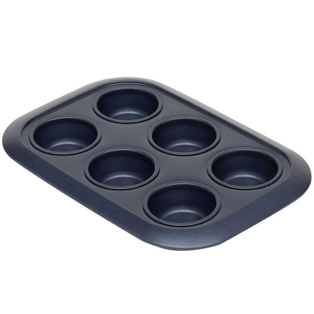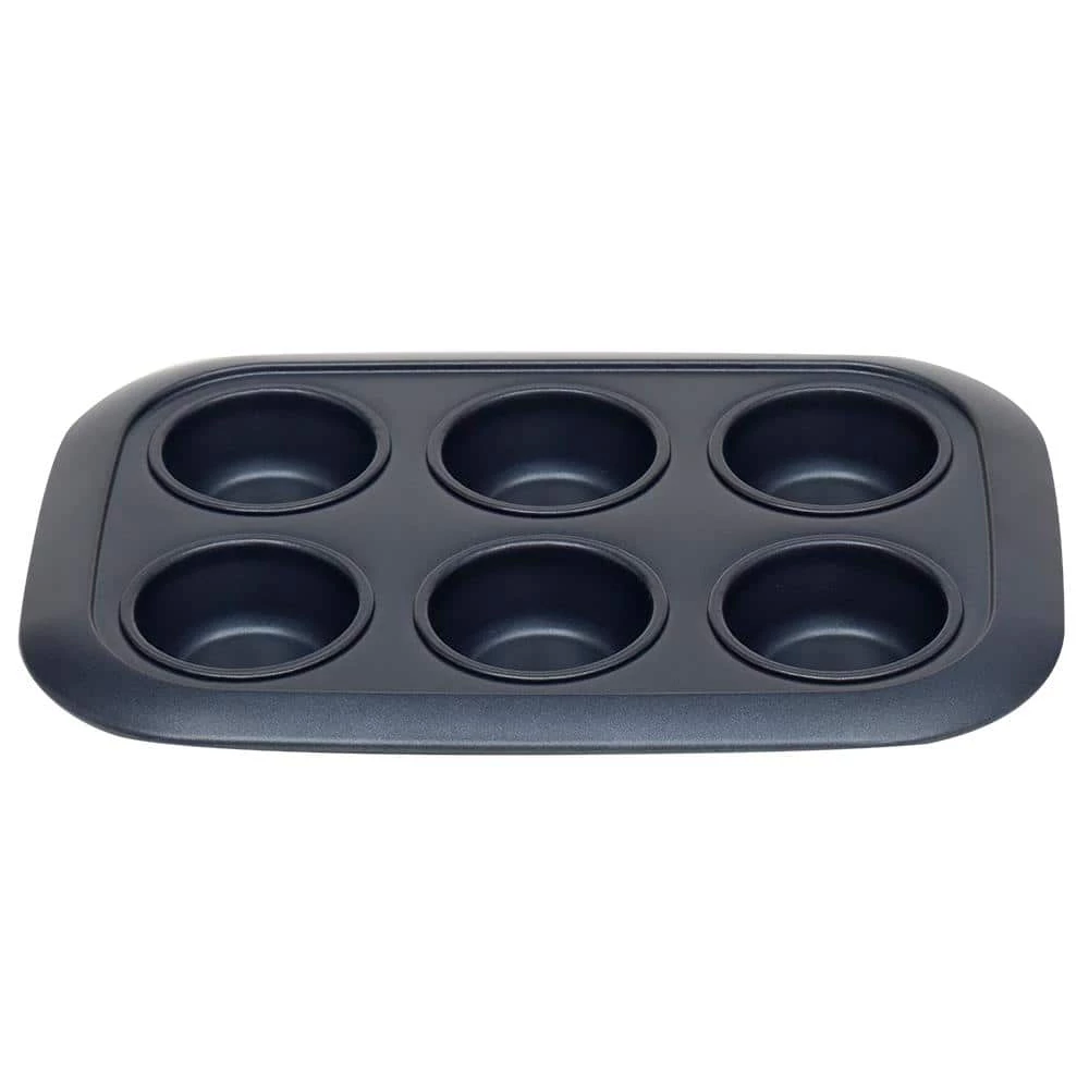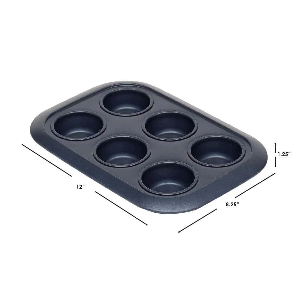 From savory breakfast muffins, delicious quiches, and fluffy dessert cupcakes bake all your favorite confections to perfection using this non stick muffin pan. Baking and cleaning just got sweeter thanks to it high performance non stick and textured bottoms that prevent your batter from fully adhering to the pan. Wide, easy grip handles make it easy to pop them into and smoothly transfer to a cooling rack after done baking. Made from premium quality, .5 mm carbon steel it provides exceptional protection against corrosion, while also ensuring an even bake for all your favorite foods. Bake up to 6 muffins. Hand wash recommended. Wash the pan with warm water. Use gentle soap Dry thoroughly. Item dimensions may differ slightly due to the unique nature of the product. Color and finish may also differ from the images shown due to difference in monitor displays. Props and accessories are not included.