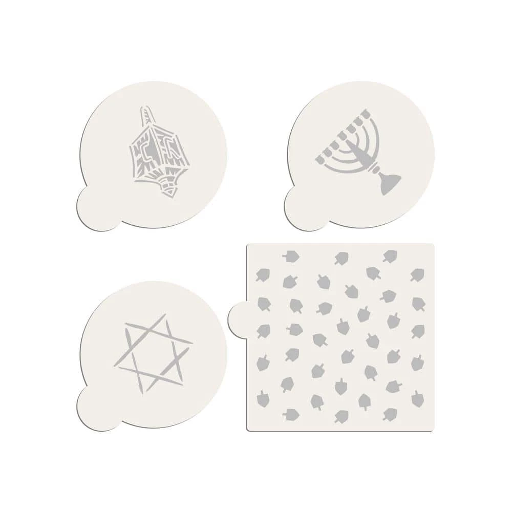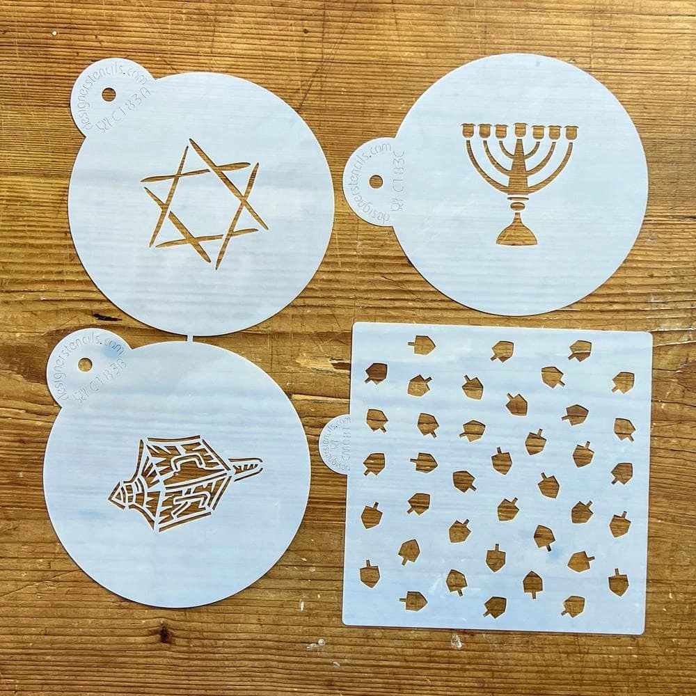 This bundle gives you 4 different Jewish patterns for decorating your circle cookies. The 1 set includes a Menorah, the Star of David, and a Dreidle. The other set includes a repeat pattern of mini Dreidles (perfect as a background pattern). Cut on durable, 10 mil food grade plastic, each circle stencil is 4.75 in. high to fit a 3 in. 4 in. circle cookie cutter.
