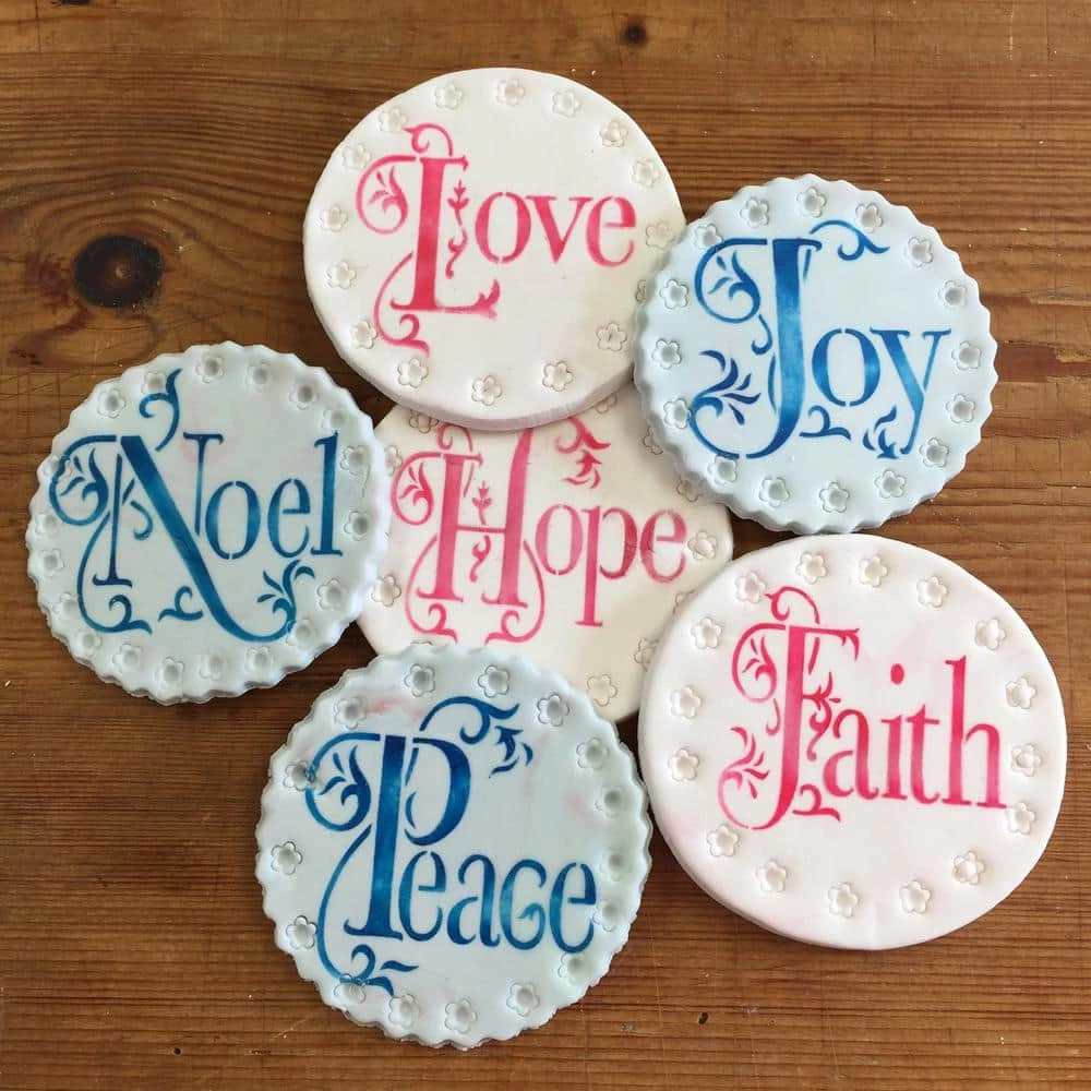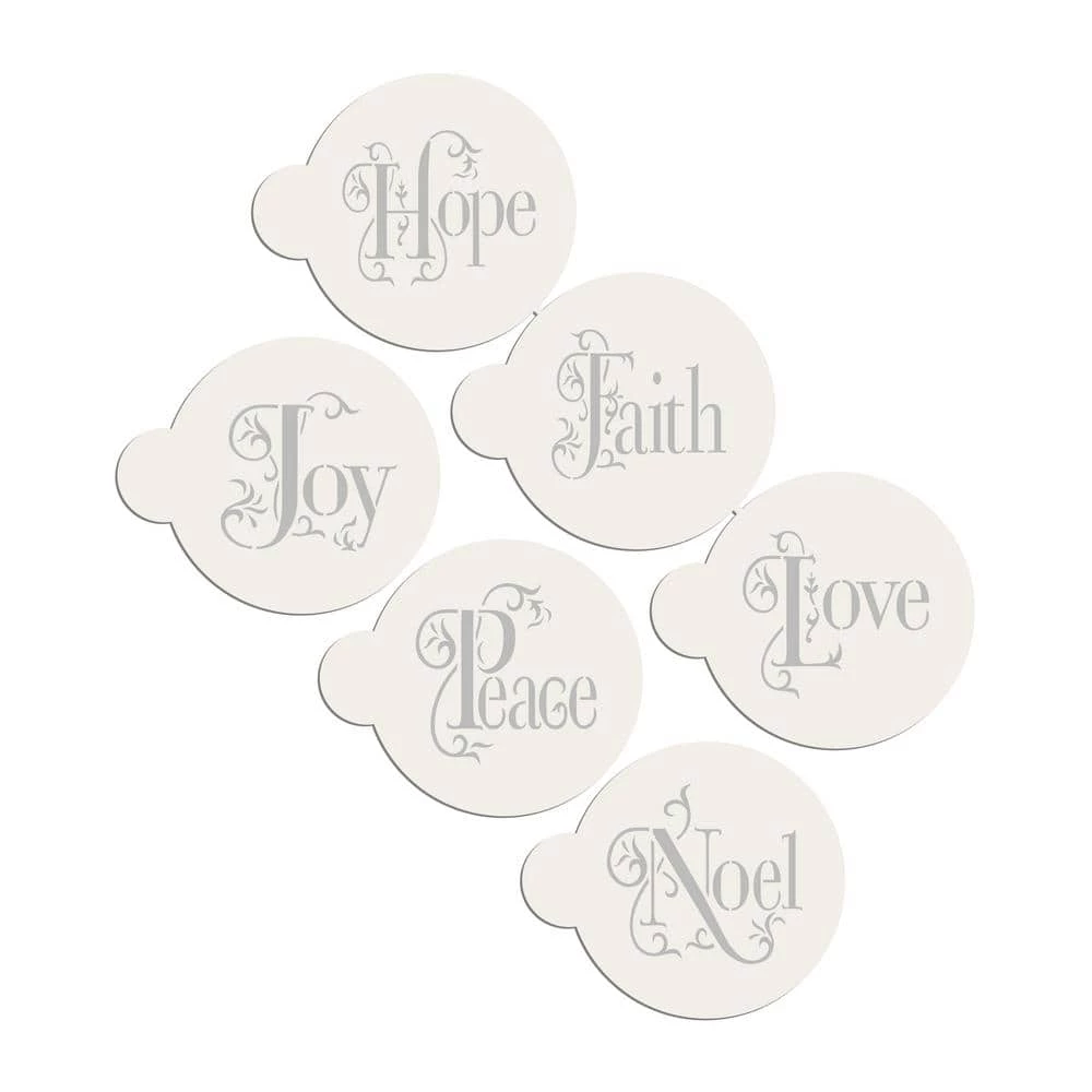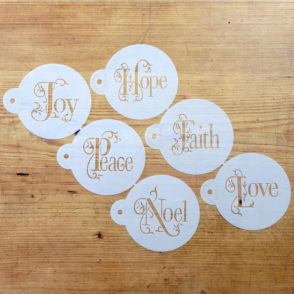 This bundle gives you six different stylized lettering patterns for decorating your circle cookies. One set of three stencils include Noel, Peace, and Joy lettering. The other set of three stencils include Hope, Faith, and Love lettering. Cut on durable, 10 mil food-grade plastic, each stencil circle is 3.75 in. high to fit a 3 in. to 4 in. circle cookie cutter.
