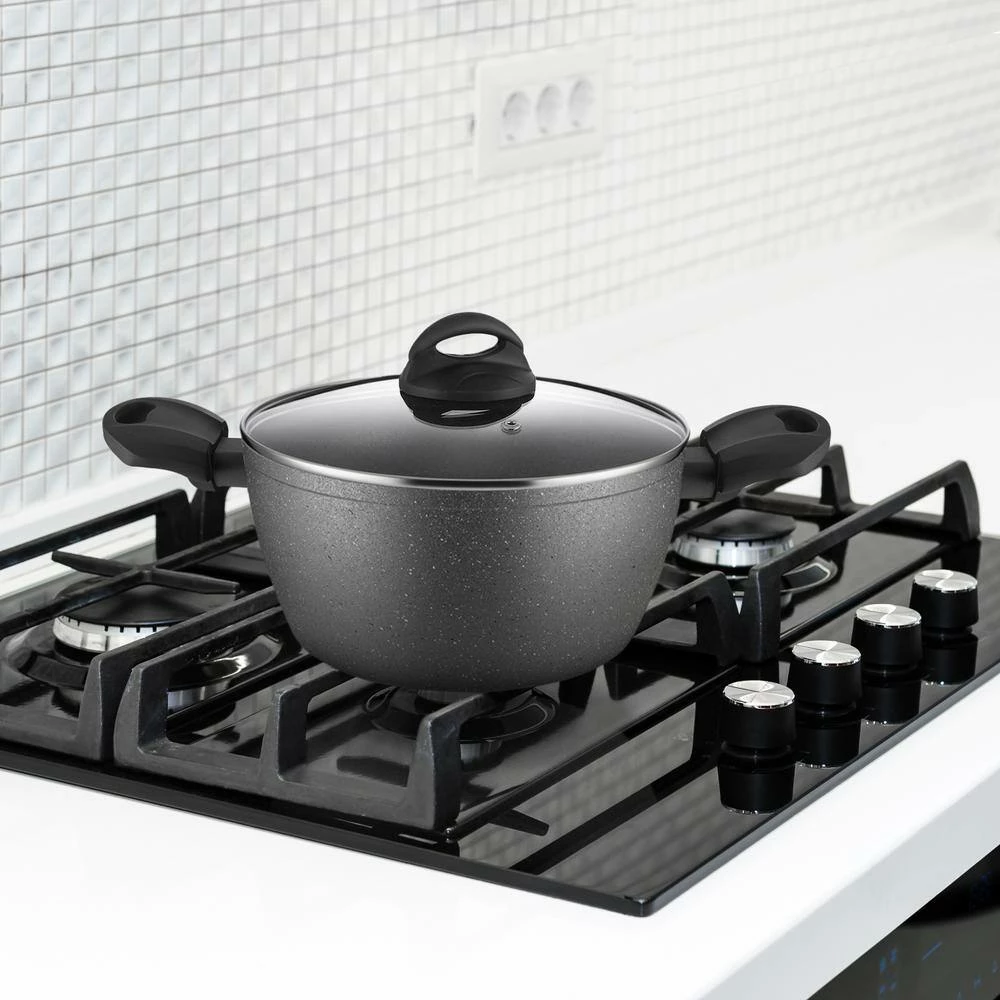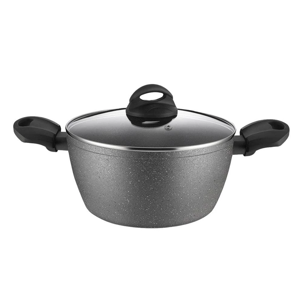 Durable, 8.7 in. round casserole with glass lid. The inner construction is pressed aluminum, with the exterior double-coated in textured nonstick coating. Inside, this casserole is covered in a triple layer of rough, matte nonstick coating that gives you the benefits of cooking on stone, while ergonomic design incorporating bake lite keeps the handle cool to the touch. The aluminum construction gives you a sturdy yet beautifully lightweight product compared to cast iron and other metals.