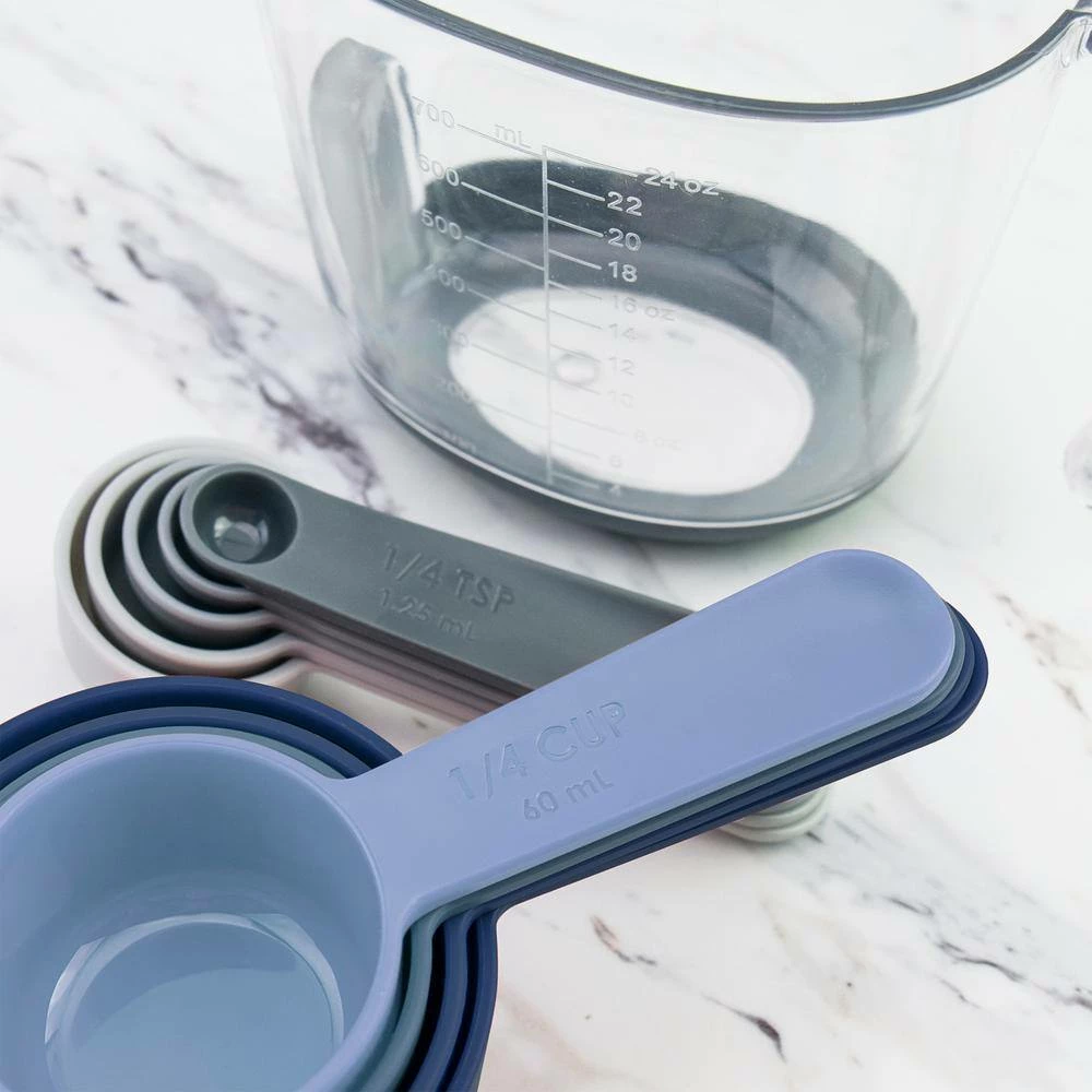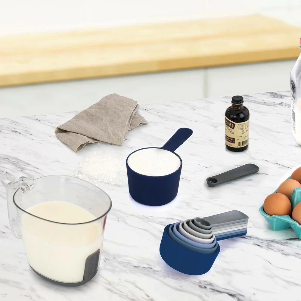 - Magnetized Nest: Measuring cups and spoons nest for compact storage; magnets in the handles of the measuring spoons and cups keep the items nested without falling or tipping.
