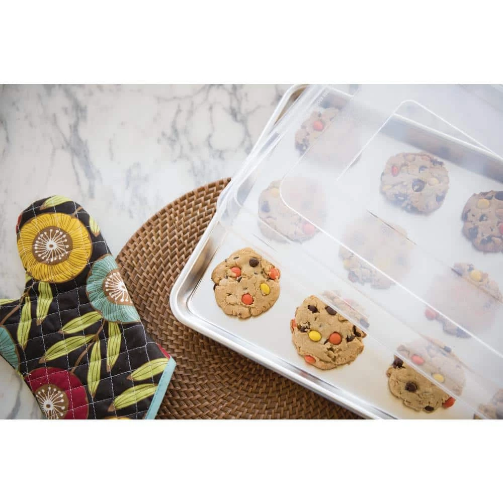 A true kitchen must-have, the Baker’s Half Sheet is our signature Naturals piece. Make storage and transport a snap with a lid that lets you take your baked goods anywhere. Professional pastry chefs and bakeries bake on aluminum for consistently perfect results. You can do the same with our commercial quality Naturals Bakeware collection. Made of pure aluminum, these premium pans will never rust and they produce evenly browned baked goods every time. Encapsulated galvanized steel rims prevent warping.