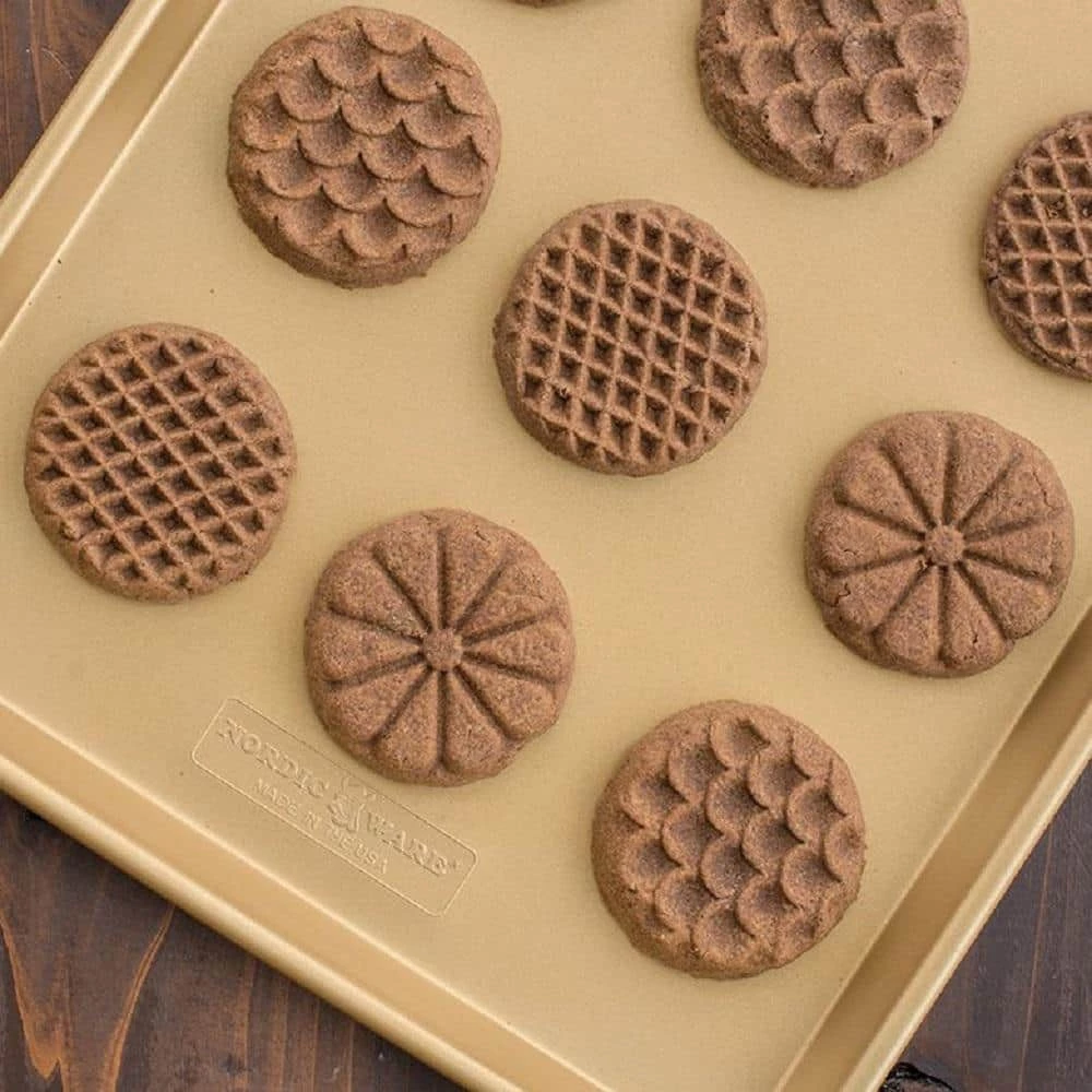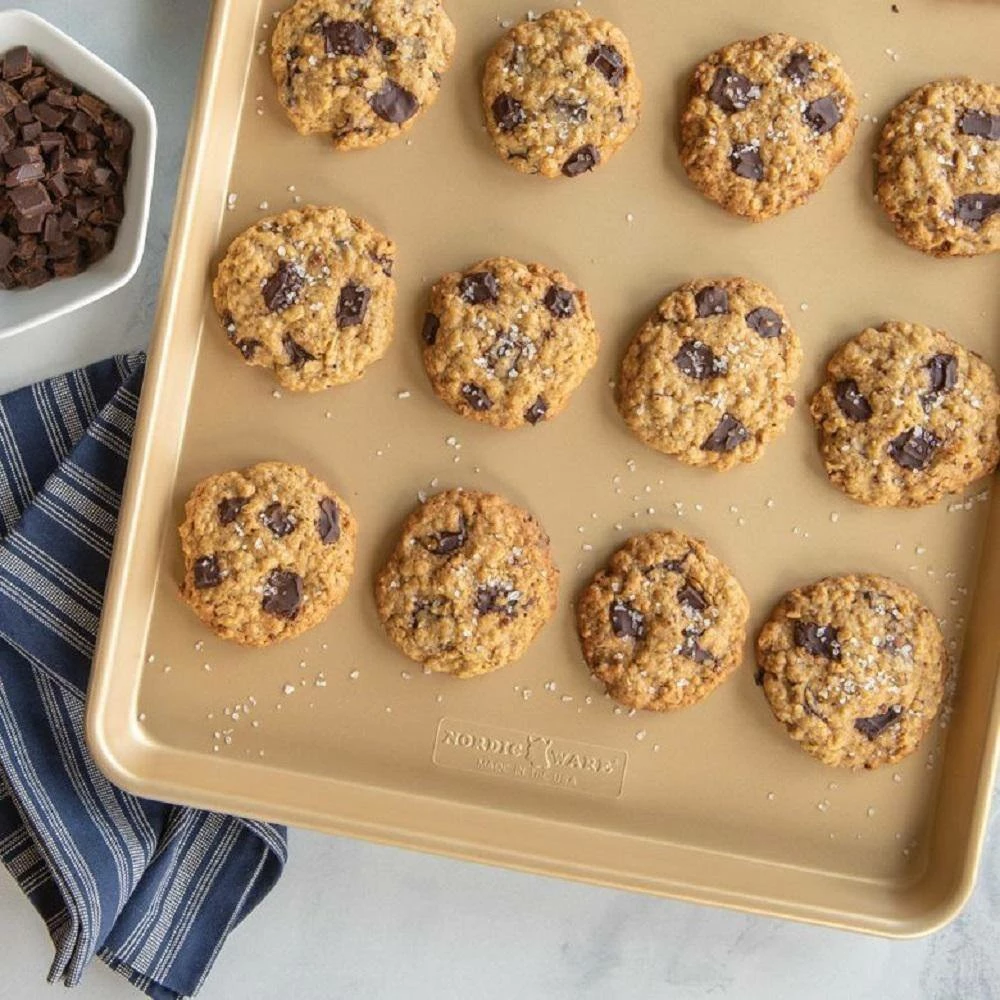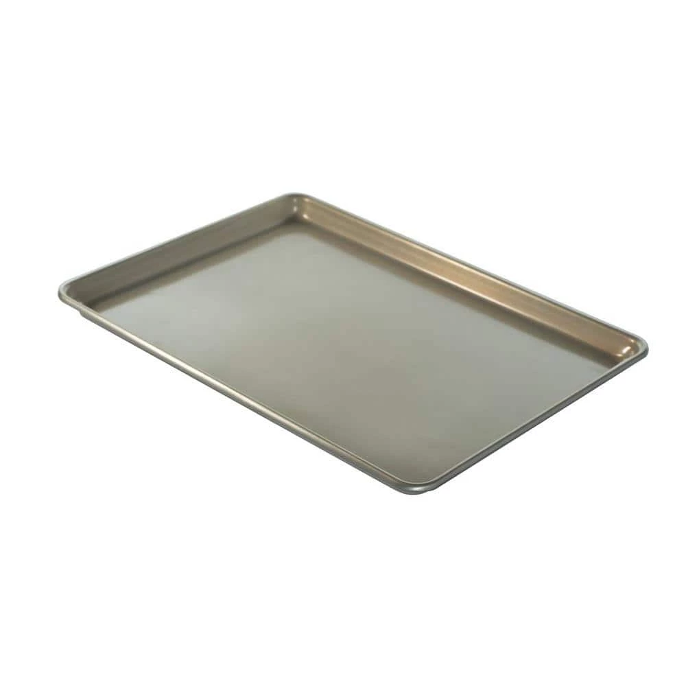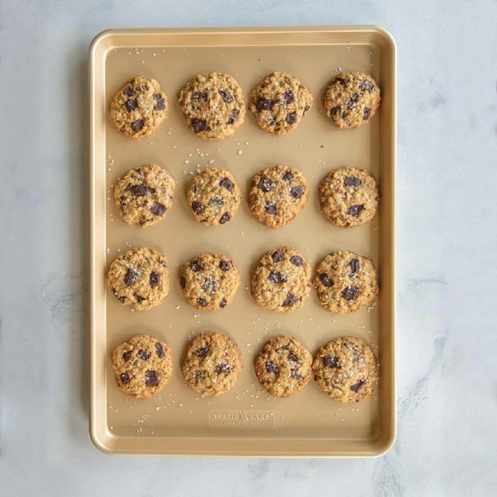 Make mega batches of cookies and bars with this extra large sheet pan. Baking professionals know that the secret to evenly baked treats is to cook with aluminum bakeware. Aluminum is widely known for its excellent heat conductivity and cooks more evenly and thoroughly than other metals. Premium gold nonstick interior is especially hard and resistant to scratching for easy release and cleanup.