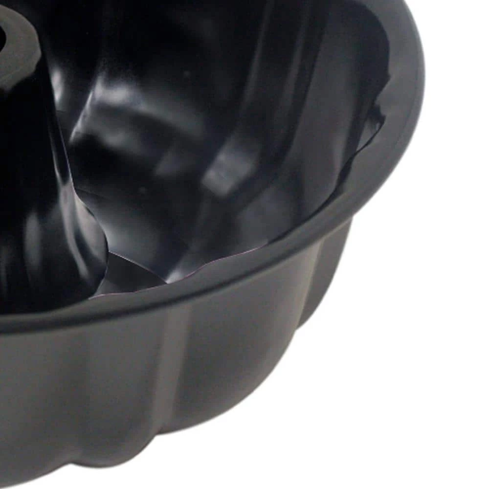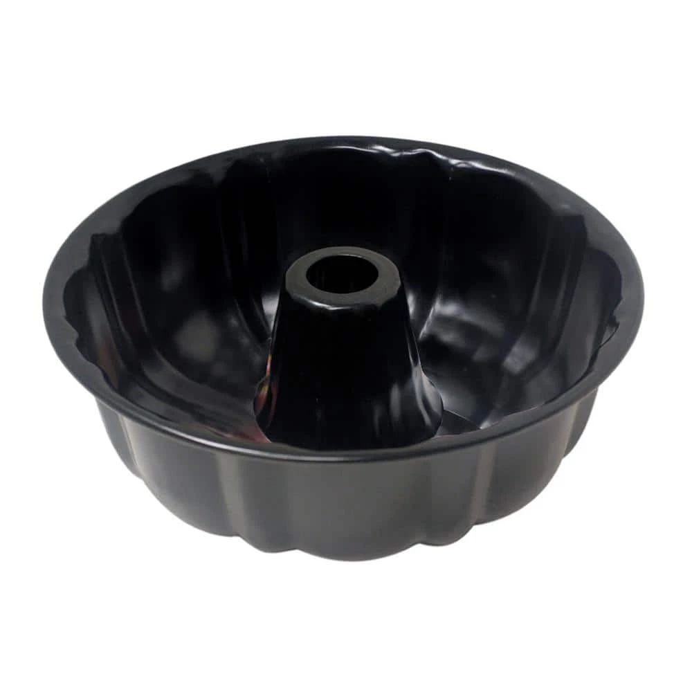 This fluted cake pan produces cakes with a decorative ring shape. Made from non-stick steel for an even bake. High center tube ensures batter in the middle is cooked evenly.