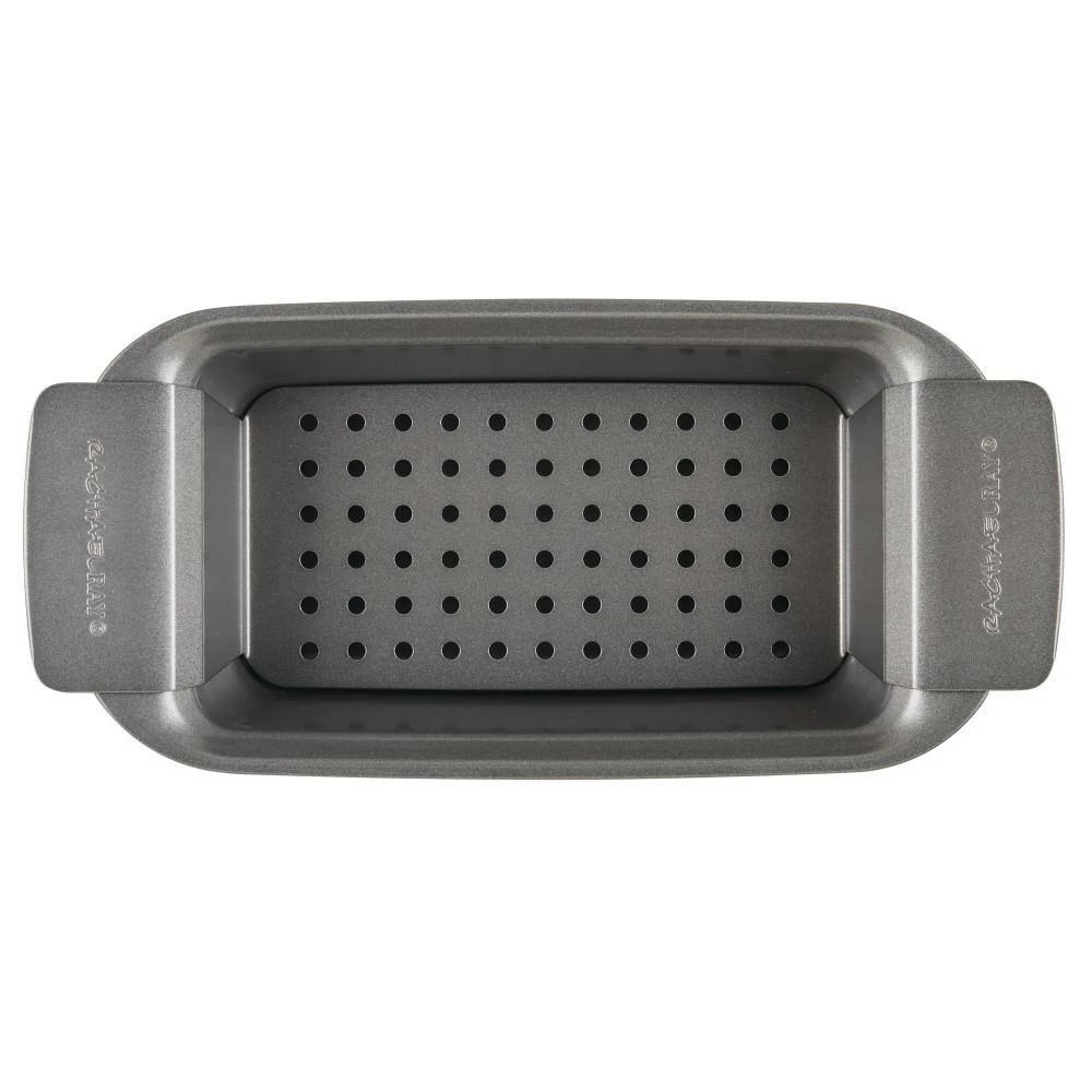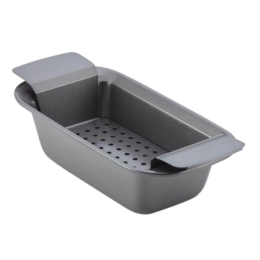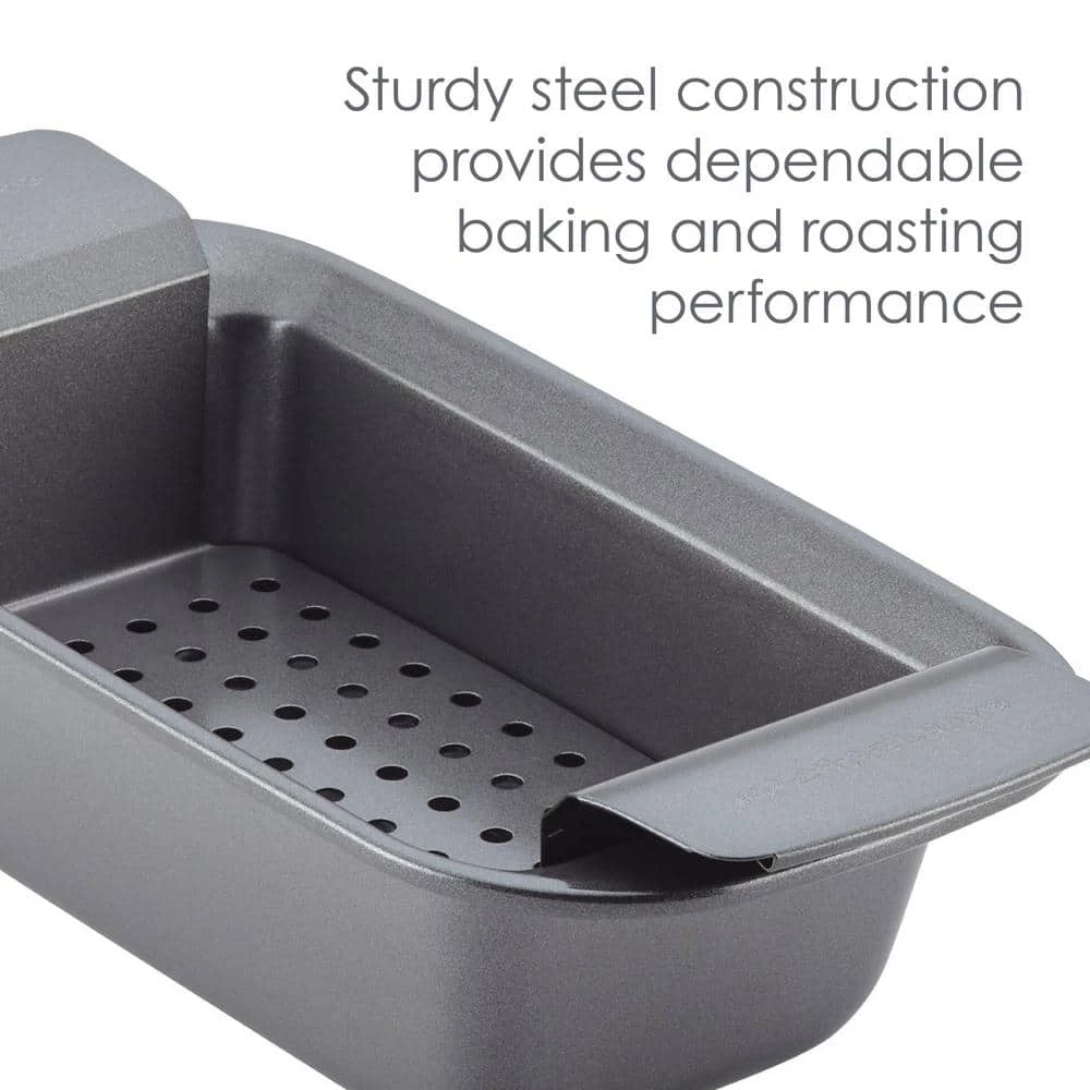 Get cooking with eye-catching Rachael Ray Bakeware Meat Loaf Pan designed to help you get the job done. This practical, must-have essential pan features comfortable grips and extra-wide handles and is constructed from durable materials that are easy to clean and care for. The new nonstick loaf pan puts the fun in functionality with a tray to pull savory meatloafs and breads from the pan in perfect form. Used without the removable insert, the main pan is the standard size for baking yummy quick breads like banana, zucchini, and more. When you prepare your favorite meatloaf recipe or follow 1 of Rachs, the perforated insert allows all those extra fats and oils to drain into the bottom of the pan. And of course, this bakeware is constructed from durable steel thats sturdy enough to go in and out of the oven again and again. Inside and out, the pan features long-lasting nonstick to deliver excellent food release and easy cleanup. Oven safe to 450°F, the wide handles provide comfortable, confident grasp even with bulky oven mitts. Add this meatloaf pan to your own kitchen to add a pop of personality, or make it the starting point for a Rachael Ray kitchenware collection of your own. Clever is as clever bakes, whether its a loaf of bread or a lean, healthy meatloaf, made in great form with the versatile Rachael Ray Nonstick Bakeware 9 in. x 5 in. Loaf Pan.
