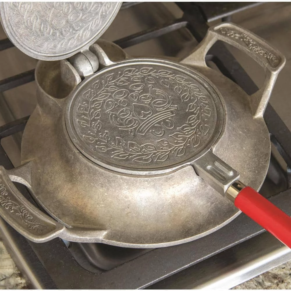 Create traditional Scandinavian, Italian cookies and cones with Krumkake and Pizzelle Iron. Krumkake is a thin, delicate embossed cookie of Norwegian origin. It is typically rolled into a cone while still warm and flexible and filled with whipped cream or fruit. A Pizzelle is a traditional Italian sugar cookie. Hinged iron’s holder is heated on stove burner after iron has been preheated, batter is added and cooked briefly on each side by rotating the iron. Remove cookie and roll it around cone while warm to form a beautiful and delicious treat.