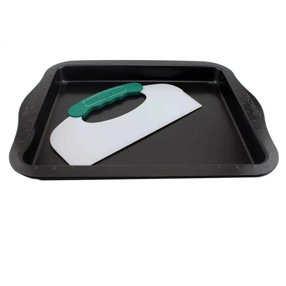 The 14 in. x 11 in. Perfect Slice cookie sheet is more than just a baking tool… it’s also a convenient way to ensure your cookies and brownies are perfectly sliced every time. The unique guideline grid around the outer edges of the pan allows you to easily line up the included Perfect Slice cutting tool and cut the perfect portion size. Make perfectly-sized slices every time. Dishwasher safe.