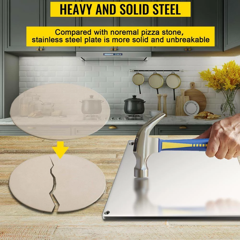 - HEAVY DUTY PIZZA STEEL: Durable steel pizza stone, with a smooth, chemical-free surface, can achieve odorless, smokeless grilled pizza stone, will not crack or deform so that you can use a standard household oven to make delicious brick oven quality pizza