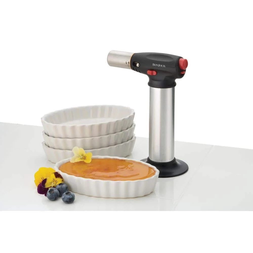 - Includes,brushed stainless steel Torch, 4 4-oz. porcelain oval ramekins