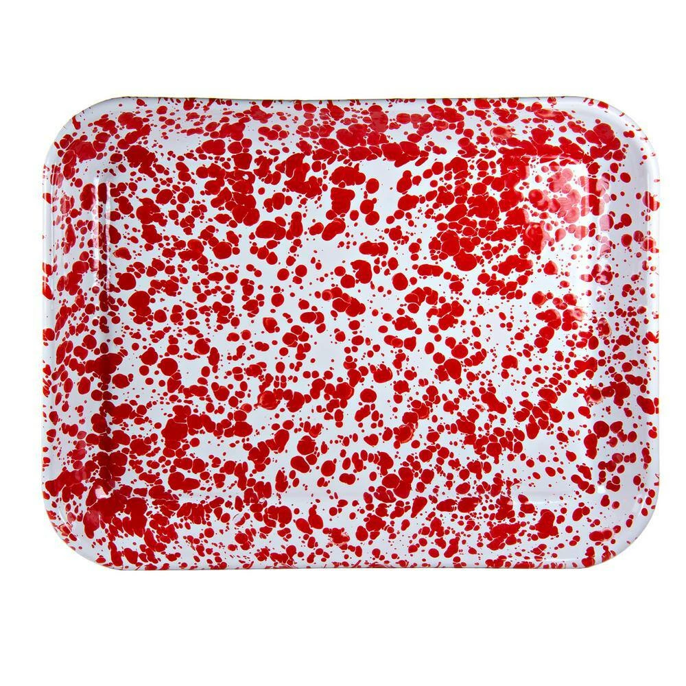 Set of 2 12 in. x 10 in. trays This enamelware is made of carbon steel coated with a porcelain enamel and trimmed in stainless steel. There will be variations in the shading of colors and pattern formations which are the results of the hand-dipped process. The swirl design is a classic, retro staple for enamelware cookware and serveware. The contrast of colors creates a distinct look and brings a casual artistic flair to your table setting. Each piece is individually hand crafted and is as unique as you are. Skilled artisans hand dip the white background color, then use a brush to hand apply the secondary color swirls. This creates a unique piece and design each time. The elegant and inviting aesthetic draws the eyes into the many spattered patterns flowing throughout. Your piece will be one-of-a-kind and exclusive to you as you create your own distinctive style.