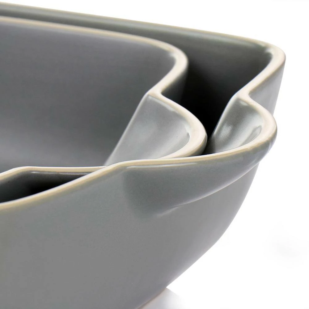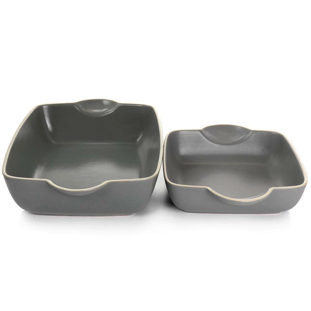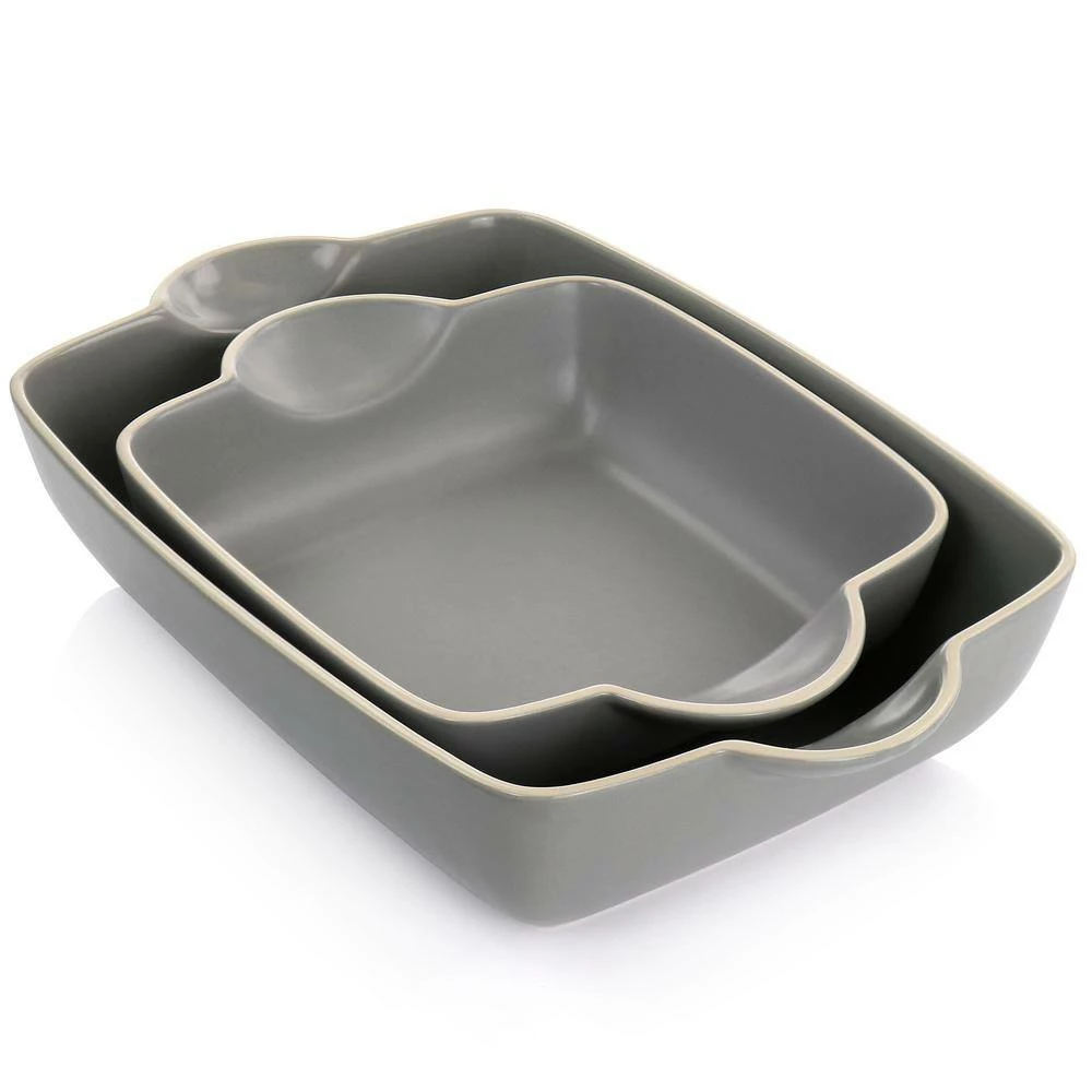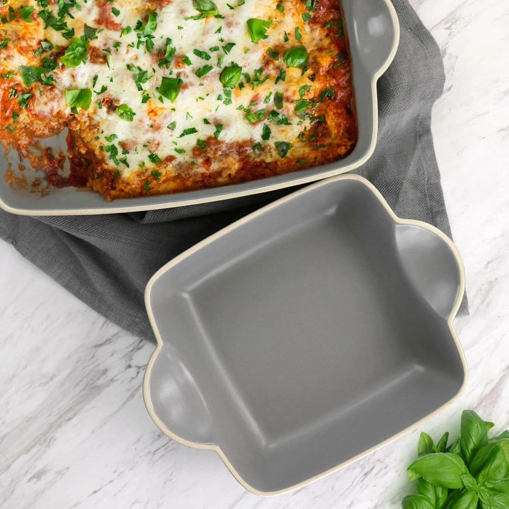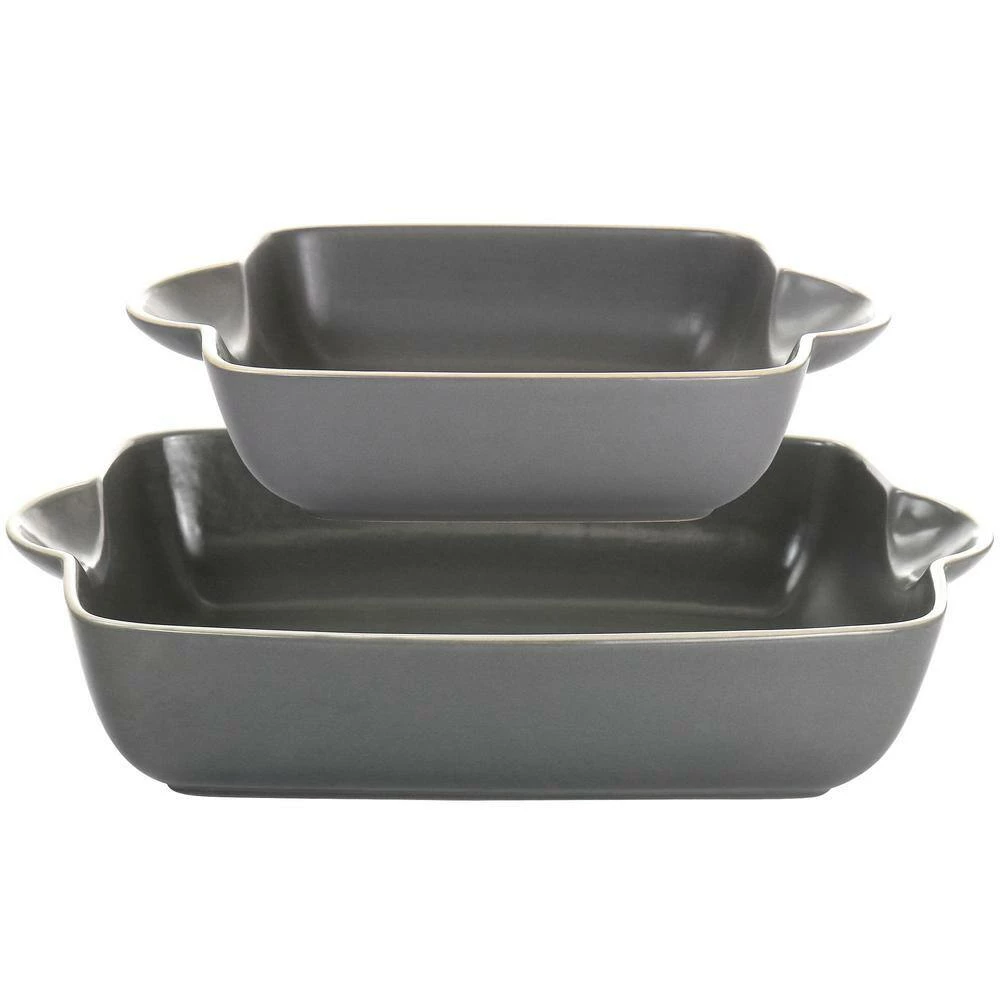 For lasagna, casseroles, cobblers, and more, this 2-piece Rockaway stoneware baker set by Gibson Home offers a space saving solution to your essential bakeware needs. This set comes with one 13in rectangular baker and one 8in square baker that are nestable for easy space saving storage. Integrated handles make carrying from oven to table a breeze, and the stoneware construction is durable and meant to last. Cook your favorite dinners and desserts with this 2-piece set.