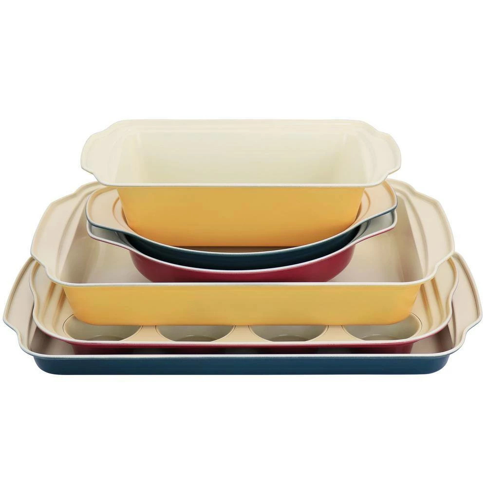 - Set includes: 2-8 in. round cake pans, 1-9 in. x 5 in. Loaf pan, 1-12-cup muff in. pan, 1-13 in. x 9 in. roasting pan, 1-15 in. x 10 in. cookie sheet