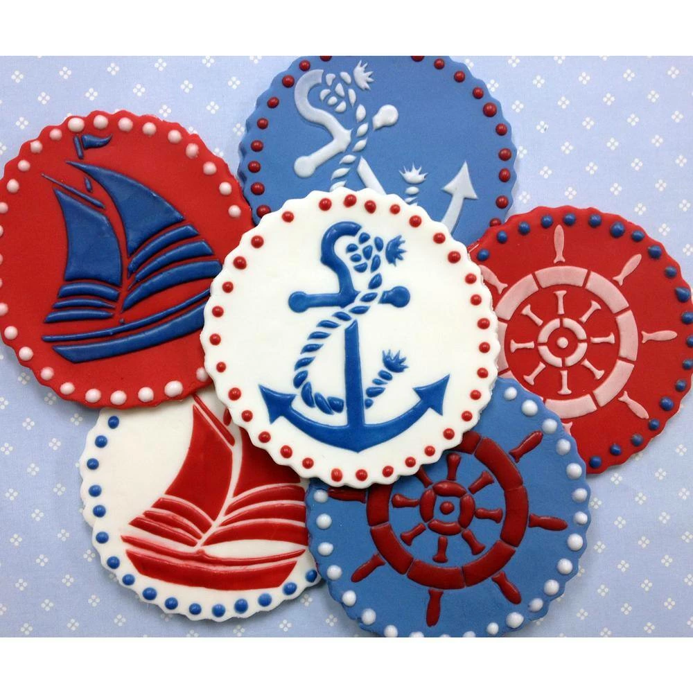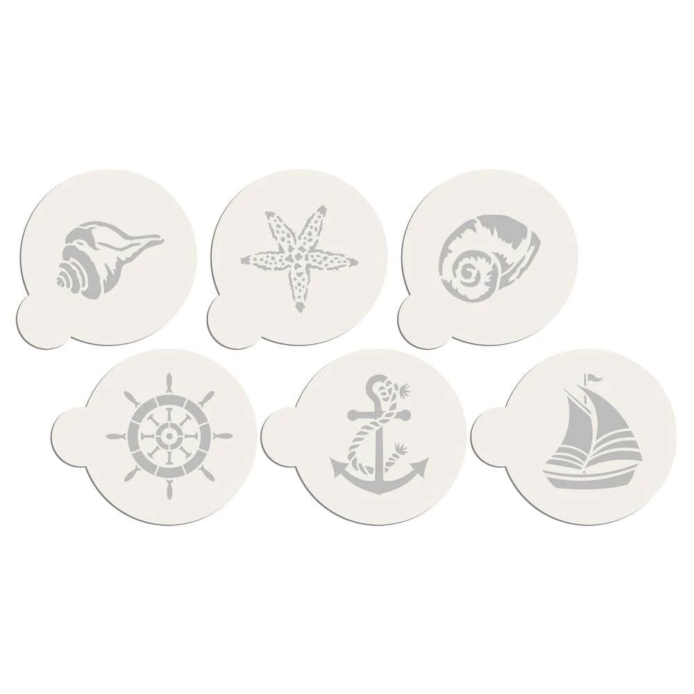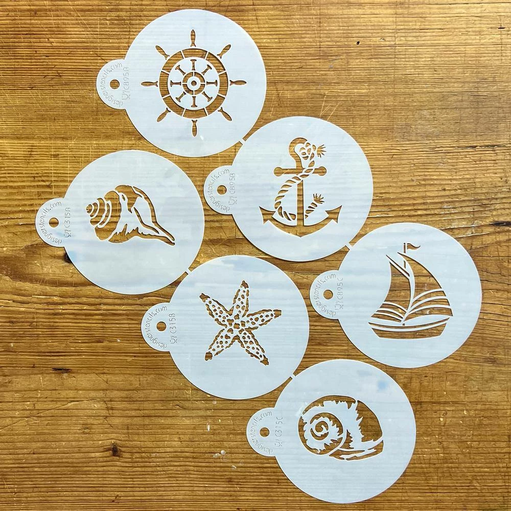 This bundle gives you 6 different nautical patterns for decorating your circle cookies. 1 set of 3 stencils include various seashells. The other set of 3 stencils includes anchor, sailboat, ship wheel. Cut on durable, 10 mil food grade plastic, each of the stencil circle is 3.75 in. high to fit a 3 in. to 4 in. circle cookie cutter.