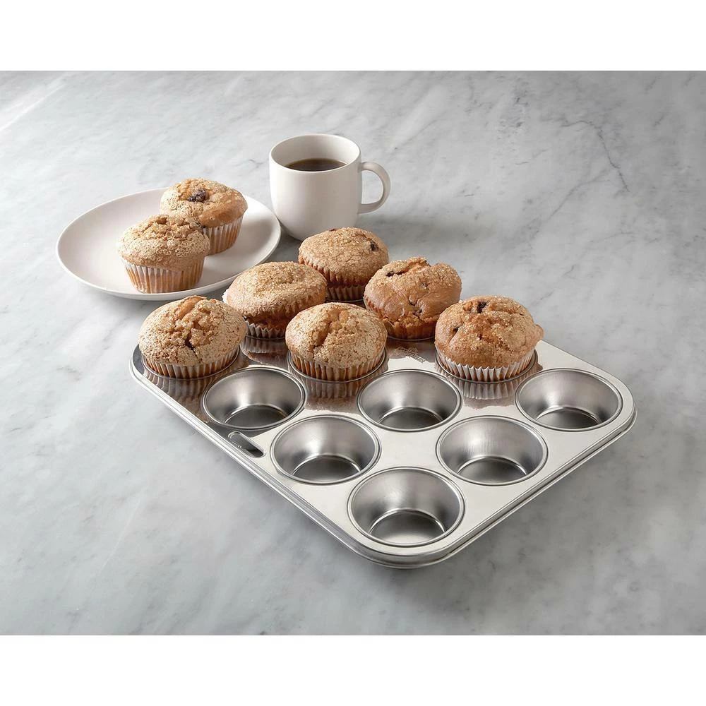 Bake mouthwatering muffins with this Muffin Pan. Our beautifully crafted stainless steel bakeware features a stain, scratch, and rust resistant surface that will not warp or corrode, but will preserve its elegant shine over time. Having the ability to withstand extreme temperatures and heavy scrubbing, this non-reactive and nonporous pan will provide for years of safe and successful baking. The pan features 12 molds, perfect for muffins or cupcakes, that will evenly brown due to the pan’s uniform heat transferring ability. Works great with or without cupcake liners. Enjoy a warm, soft and perfectly-domed muffin in the morning to get your day started on a good note, and bake Fox Run.