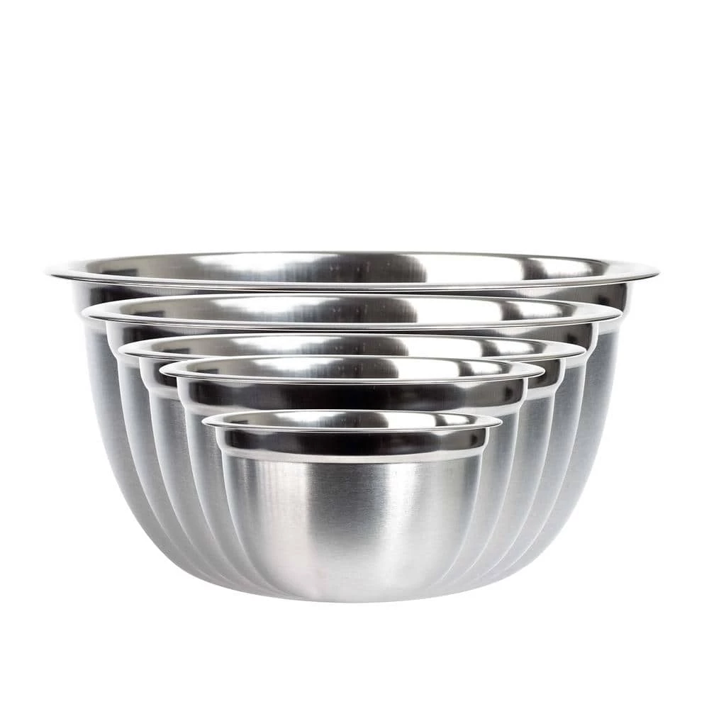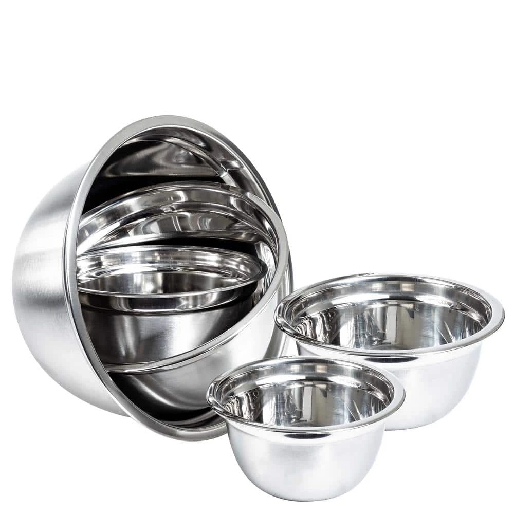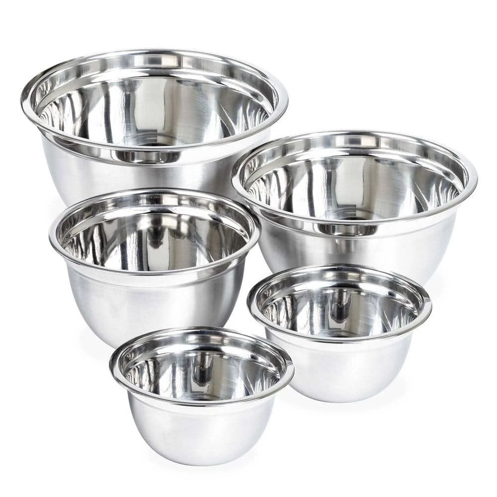 This stainless-steel bowl set is designed deep to prevent spills and splatter. It is easy to use and clean. Also, it is dishwasher safe. It has a Satin exterior and polished interior. This large stainless steel mixing bowl set has a size for any job whether it’s mixing, marinating, or serving. Fit this nesting bowl set together once they are washed and store them in a kitchen cabinet without taking up too much space. This sets includes: 0.75 qt. Mixing Bowl, 1.5 qt. Mixing Bowl, 3 qt. Mixing Bowl, 5 qt. Mixing Bowl, 8 qt. Mixing Bowl.