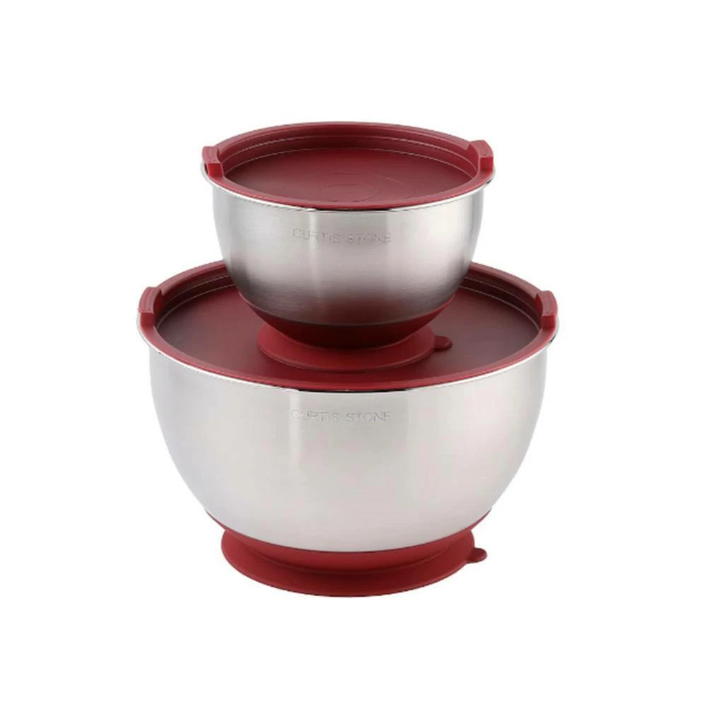 Essential equipment for cooks and bakers, our durable stainless steel bowls are an asset in any kitchen. Curtis’ innovative bowls come with a built-in silicone suction cup bottom to help hold each bowl steady, allowing you to pour ingredients and mix at the same time. Have left over mixture or need to marinate some chicken overnight. With the addition of 2 plastic lids, you can cover each bowl and store on the counter or in the fridge for later use.