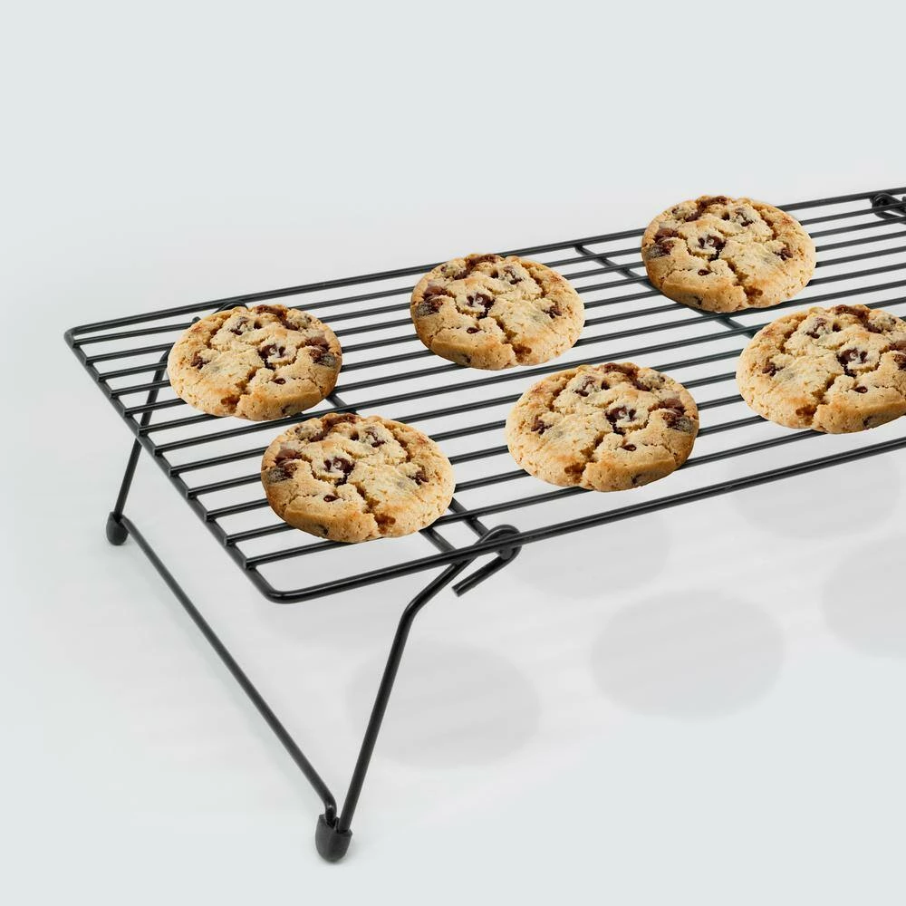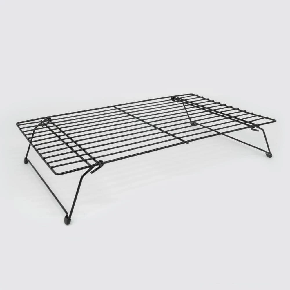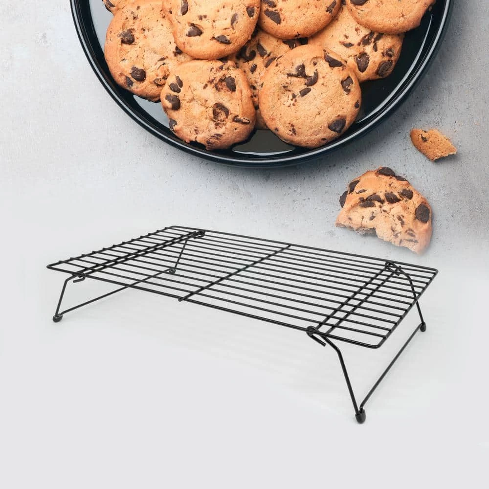 Constructed with durable powder-coated steel, this cooling rack is great for cookies, pies, cakes, and more. The 4-legs ensure pastries are raised above the counter-top and the grid pattern allows air to circulate underneath for complete cooling. Non-stick coating allows for an easy clean up after each use so more time can be spent enjoying pastries. When standing the cooling rack measures 15. 75 in. x 9. 75 in. x 3 in., giving you plenty of space for your baked goods.
