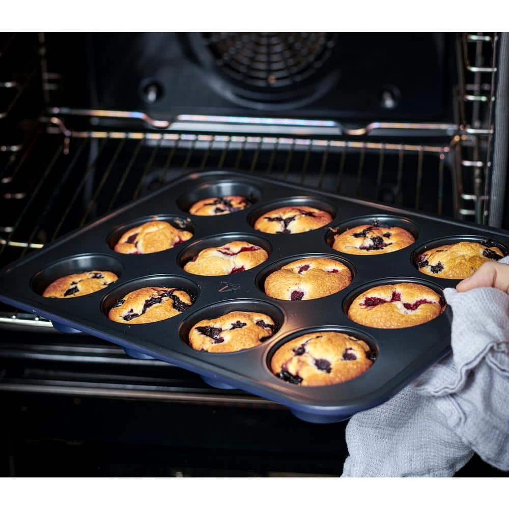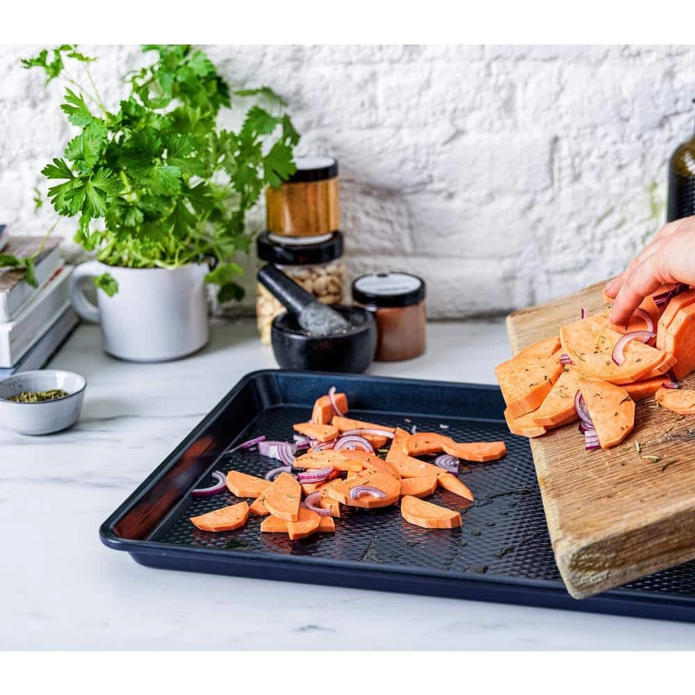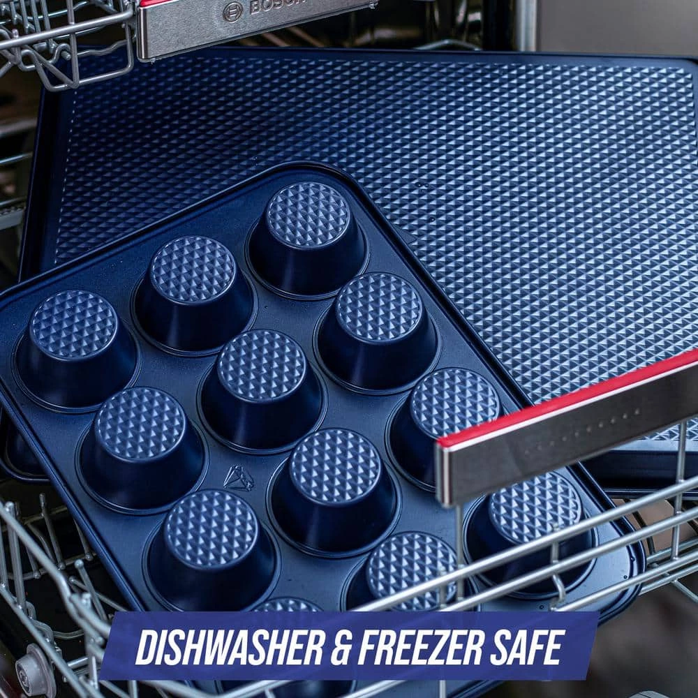 Get set to bake with Blue Diamond. Featuring Diamond Matrix Technology, each pan has a dimaond textured surface for effortless release and incredible results. Whether you have a sweet tooth or you’re craving something savory, this set does it all. This Set’s premium nonstick interior is free of PFAS, PFOA, lead, and cadmium so you can cook with confidence. Reinforced rims enhance the strength and stability of the durable steel body, which delivers fast and even heating. Rust resistant, this sheet is dishwasher and freezer safe. Oven safe up to 450°F.