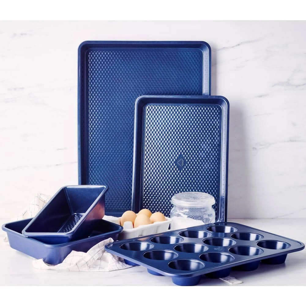 - Diamond matrix technology: 5pc bakeware set has raised diamond texture for crispy results and easy release