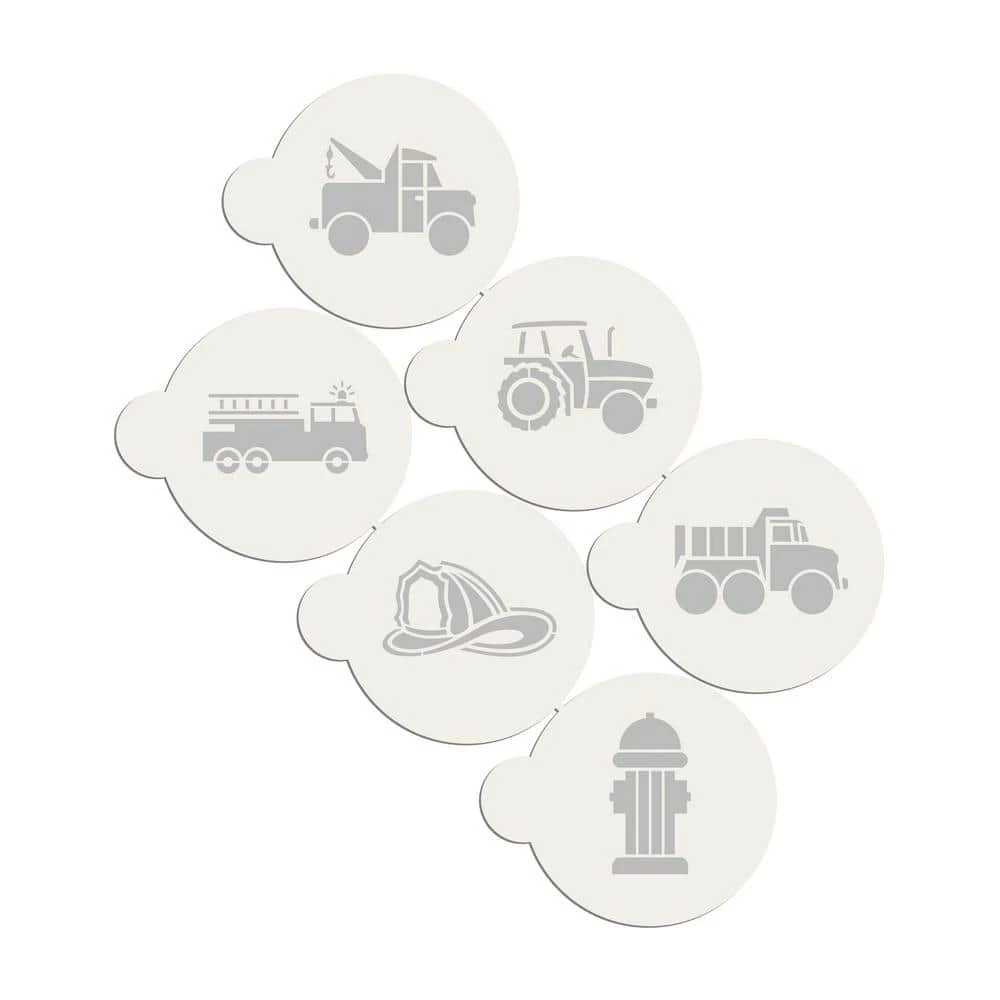 This bundle gives you 6 different firefighter and big truck patterns for decorating your circle cookies. 1 set of 3 stencils include Hydrant, Firefighter Helmet, and Firetruck. The other set of 3 stencils include Tow Truck, Dump Truck, and Tractor. Cut on durable, 10 mil food grade plastic, each stencil circle is 3.75 in. high to fit a 3 in. 4 in. circle cookie cutter.